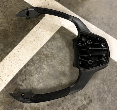 En bref, il faut enlever le top case et le porte paquet si vous en avez. Dévisser la pièce de carrosserie qui est cassé et du coup on a accès aux 2 cotés du trou à boucher.